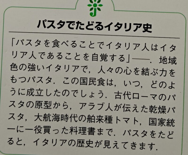 岩波ジュニア新書を読みました。パスタにまつわるエピソードが満載。南米や欧州、世界の歴史も合わせて旅ができました。