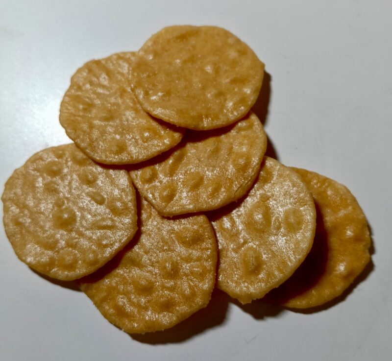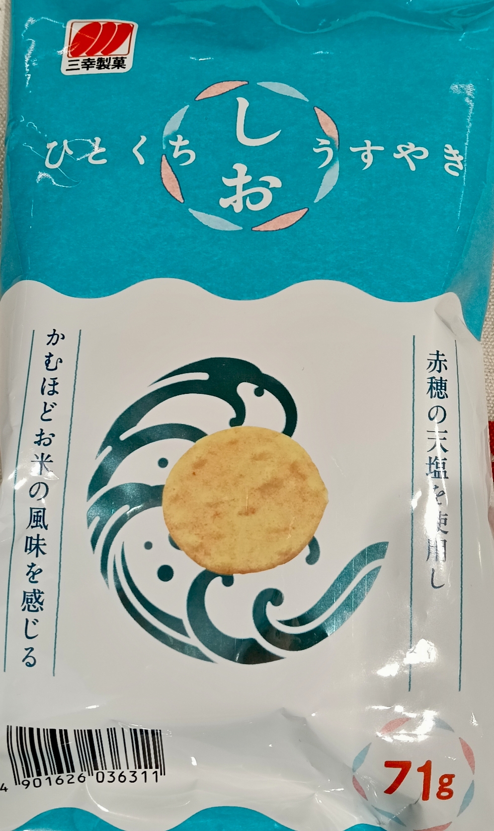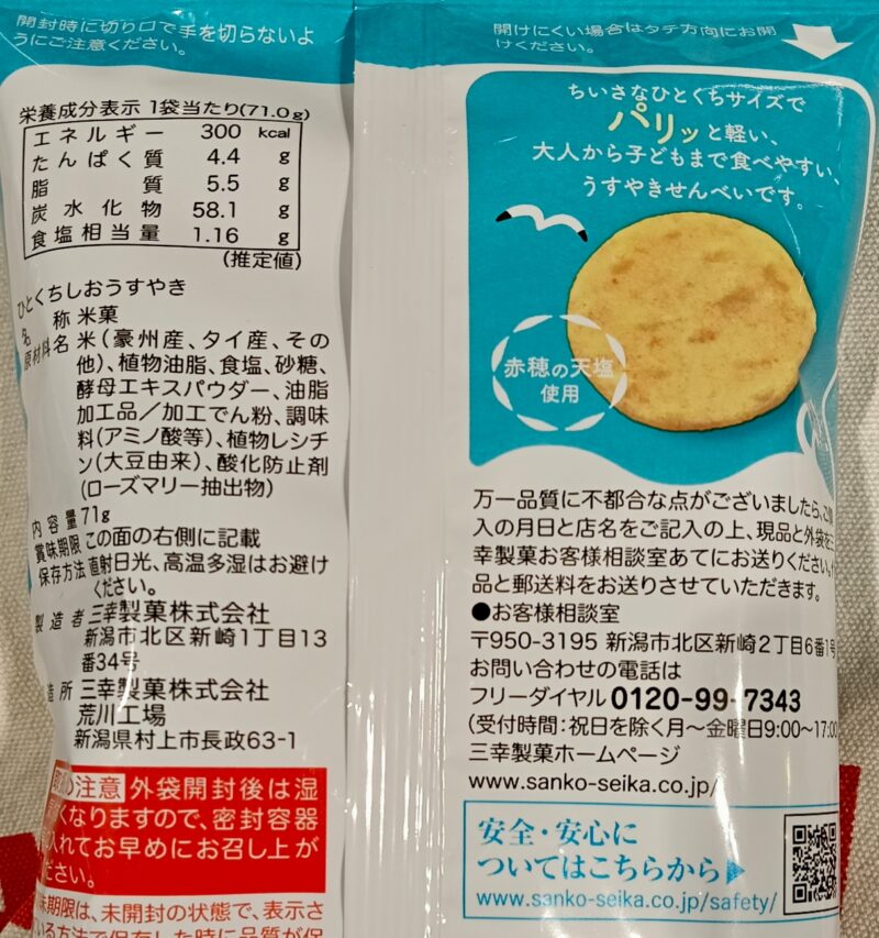 見つけたのは塩味のお煎餅です。三幸製菓さん。71㌘105円でした。