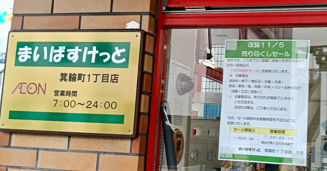 近所のまいばすけっとさん。明日から3週間ほど改装とのことでお酒以外は30%オフで1日限りの在庫処分セールです。