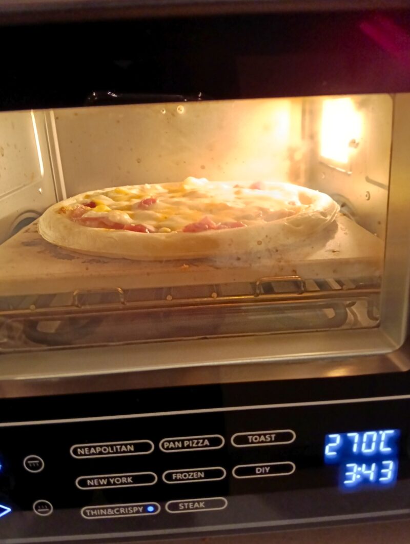 エンロで焼いてみました。THIN&CRISPYモードです、270℃に予熱して6分焼きます。