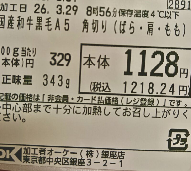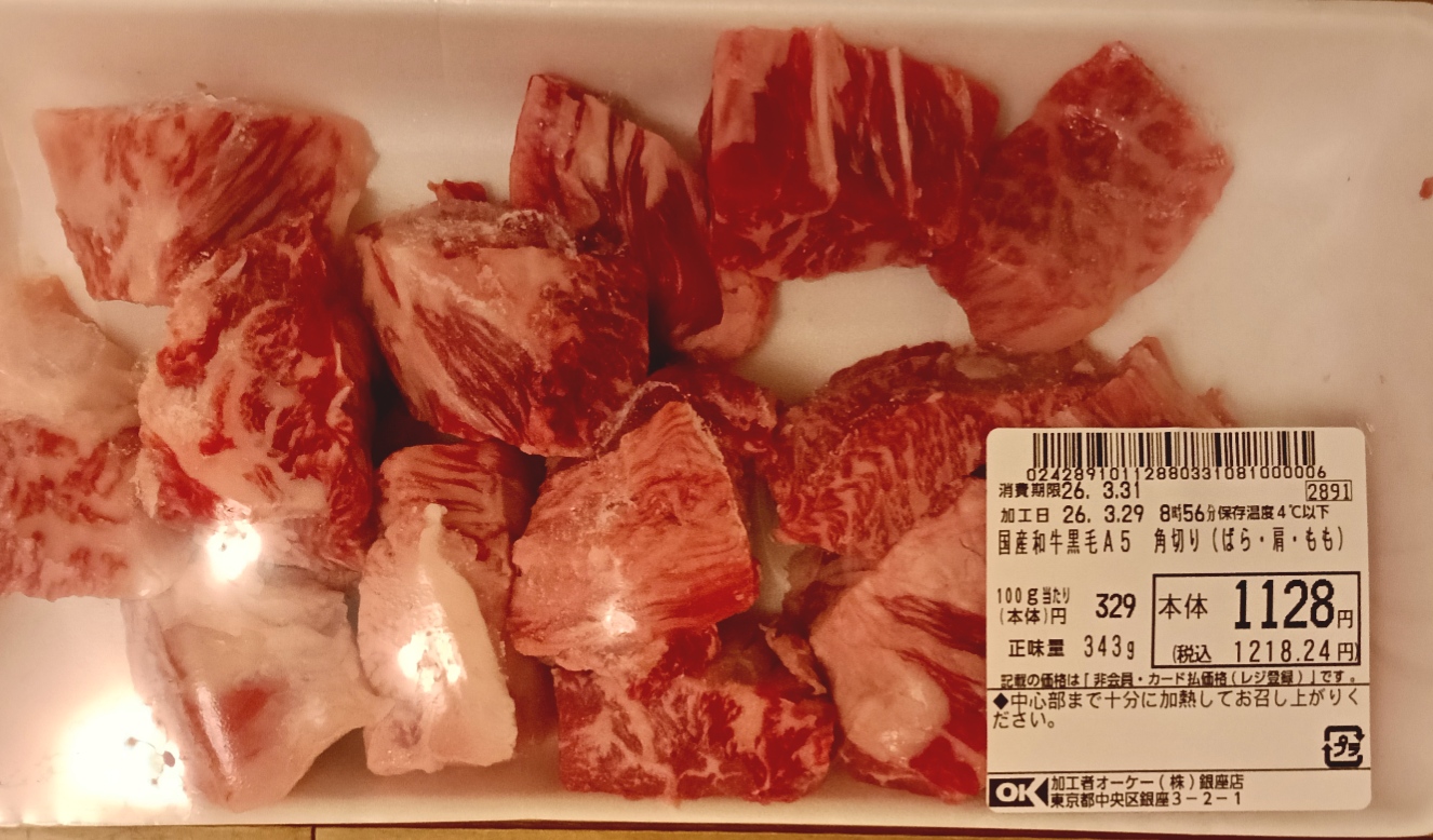 オーケーの銀座で見つけました。ばら、肩、ももの角切り。343g1218円。100g329円でした。