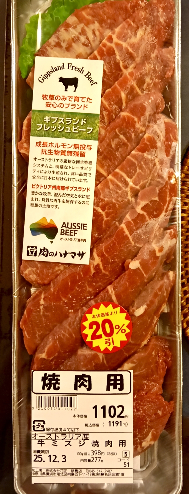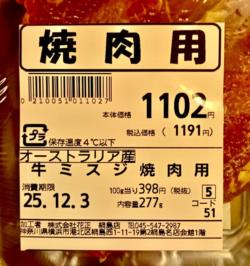 綱島のハナマサで買いました。ミスジ277g。100g当り398円ですが、20%割引で952円。