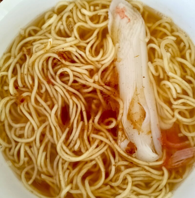 鍋にお湯を沸かしてインスタントの麺と紅白カニかまも入れて3分間煮ます。