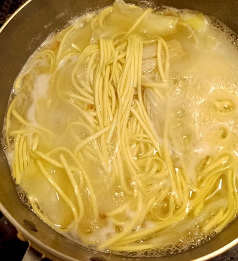 昨日の余った、キャベツとえのきを入れて煮ます。麺は5分ほど。ちょい早めでも良かったかな。
