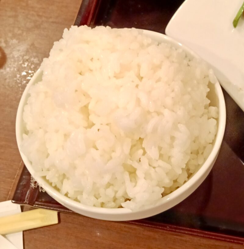 ご飯の盛りが良いです。サラダ。スープ、メインに杏仁豆腐。メインのお皿は真ん中が窪んでいるのでレバニラは標準が大盛サイズです。食べ盛りさんいらっしゃいです。