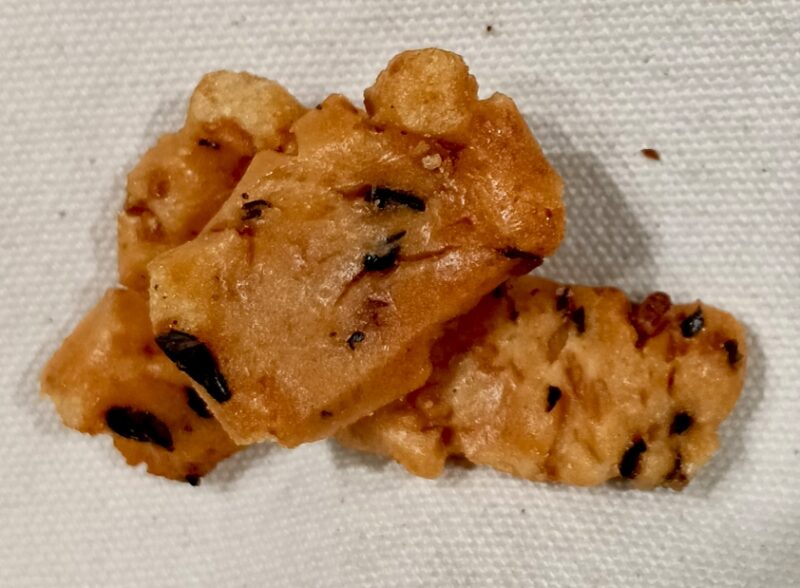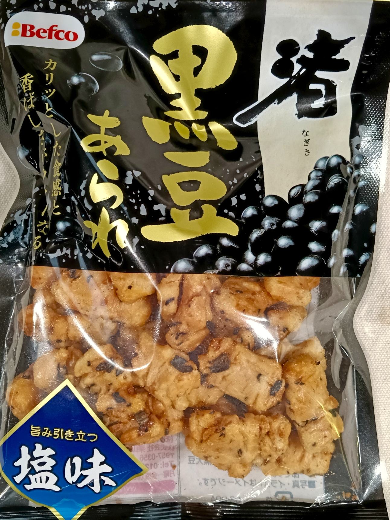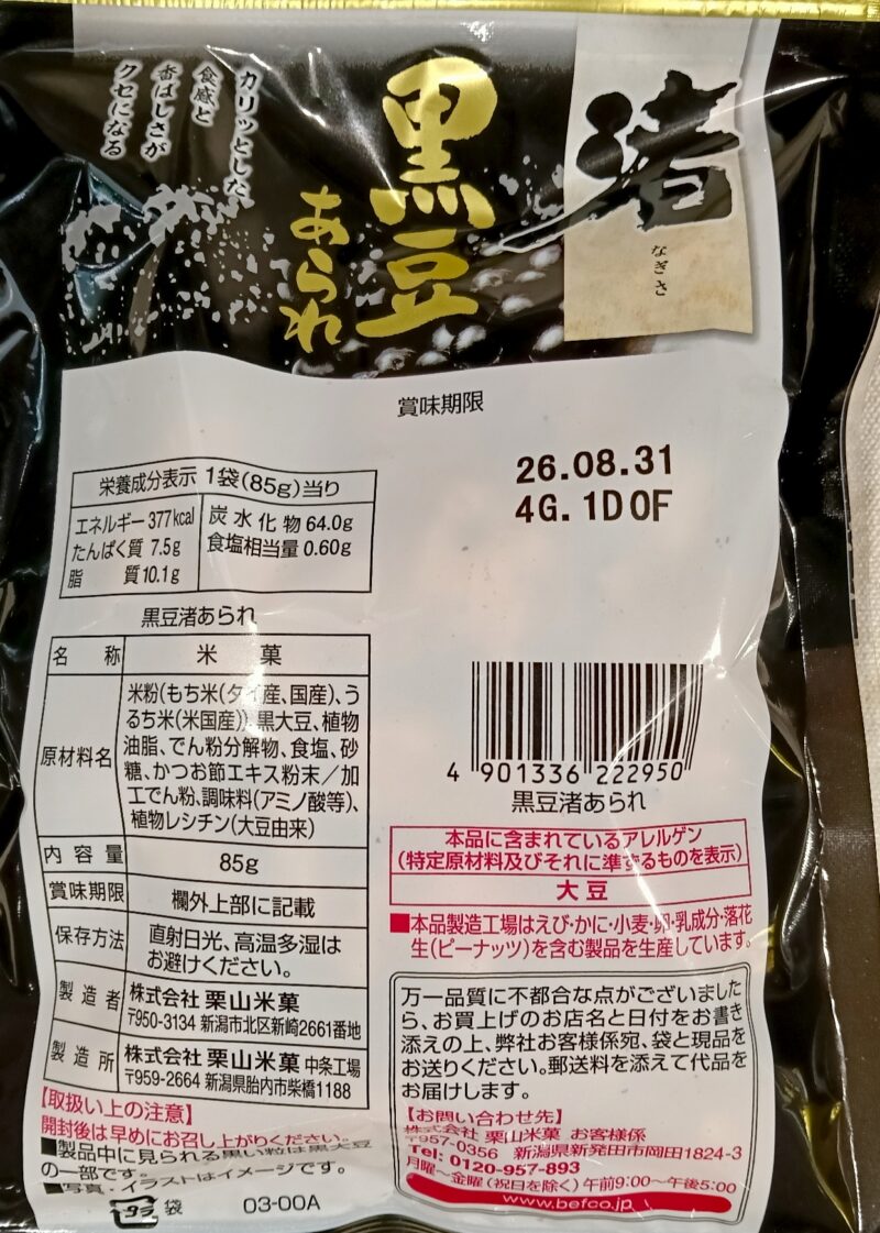 town東京都銀座food食べ物オーケーお菓子煎餅 ベフコ渚黒豆あられ栗山米菓銀座オーケー 渚黒豆あられ しょうゆ顔で塩味? Oplus_131072 2026.03.29 銀座オーケーで。85㌘、156円。 見た目は醤油色ですが、使われていません。黒豆とかつお節エキスの色でしょうか。 Oplus_131072 Oplus_131072 砂糖は使われています。隠し味ですね。 食べてみると思ったより軽い。塩味もライトで小粒なので進みます。いかんいかん。 チャック付き袋で保存が安心。考えられています。ありがとうございました。 Post Views: 17