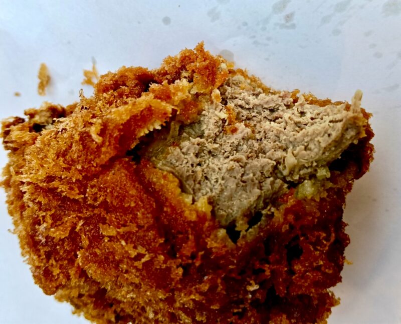 自転車でこちらへ。コロッケとレバーカツ。137円と111円。