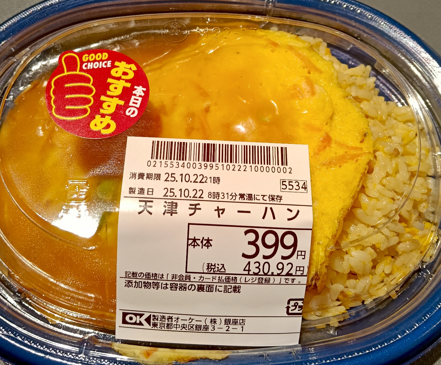 銀座で天津丼と炒飯、合わせて430円