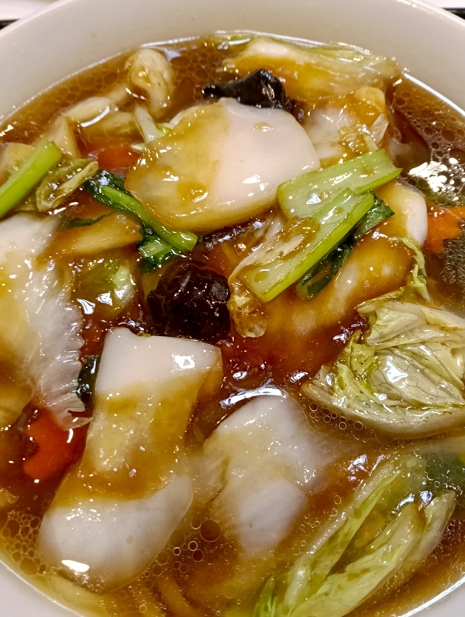 白菜、人参に青菜。筍など、よく煮込まれたスープが美味し。
