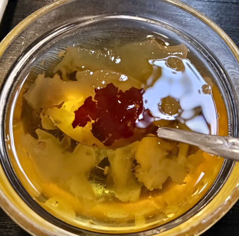 デザートはあんごま団子、クラゲスープ。