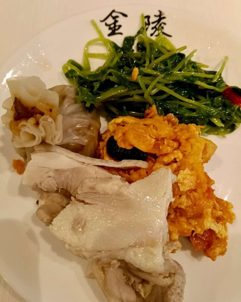 前菜は、バイキング。焼売、豆苗炒め、卵と玉ねぎ炒め、蒸し鶏などが取り放題。