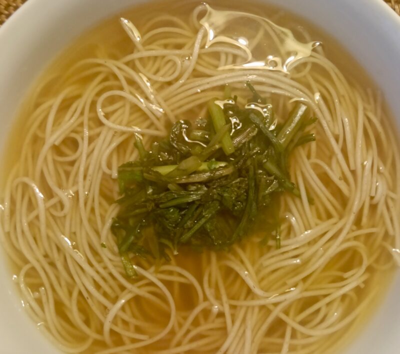 今日は温かい麺でいただきました。お鍋にお湯を沸かして沸騰させて麺を入れます。良きところでだしパックを入れて麺の茹で加減を見ながら上げます。