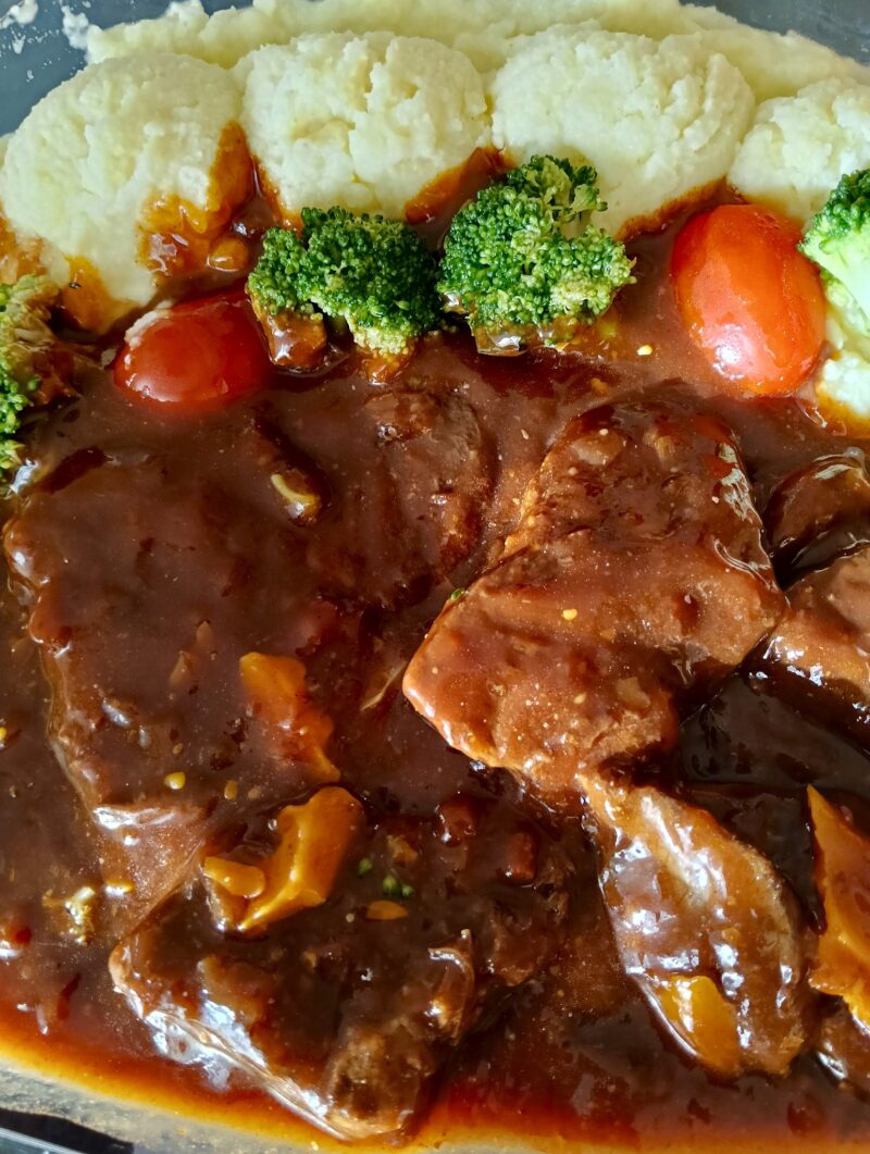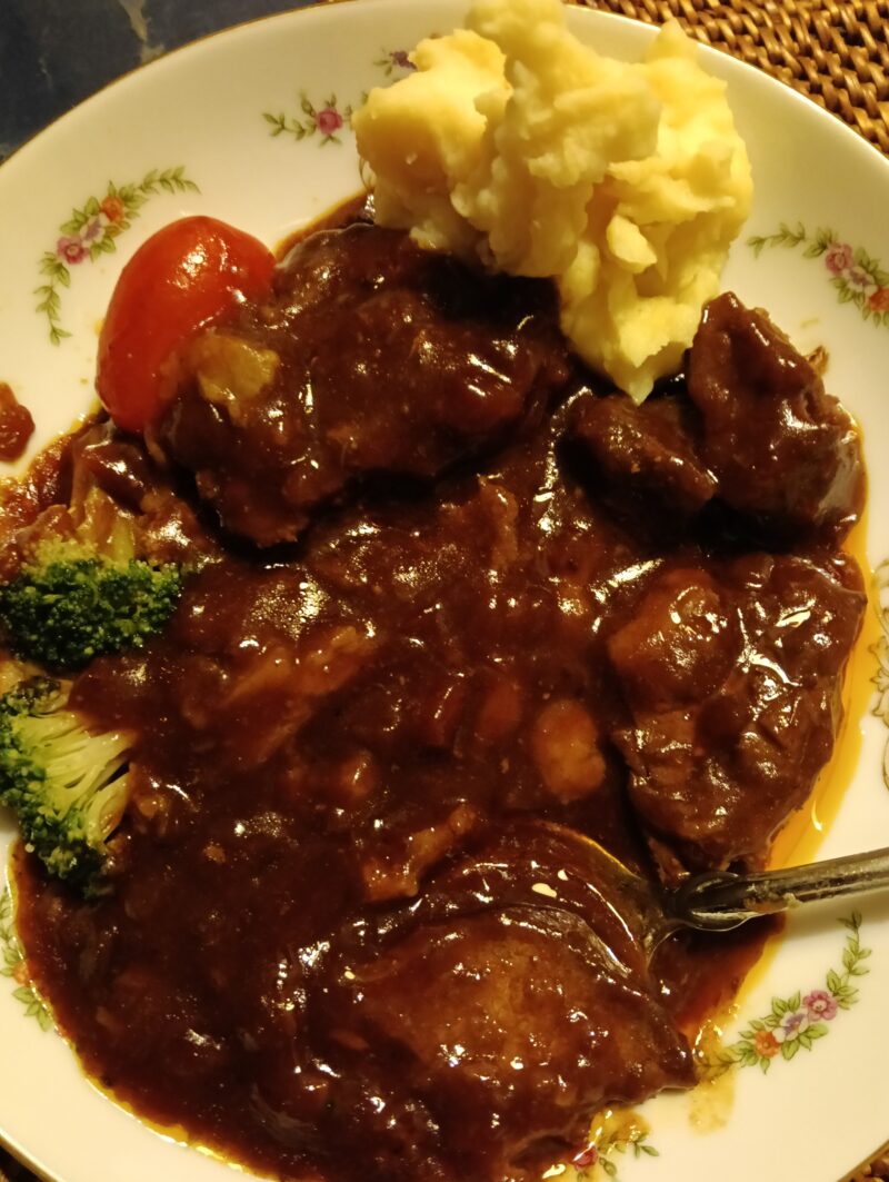 シチュー調理はレンジで500wで5分ほど。マッシュポテトは牛乳80㏄を加えて煮込んで。