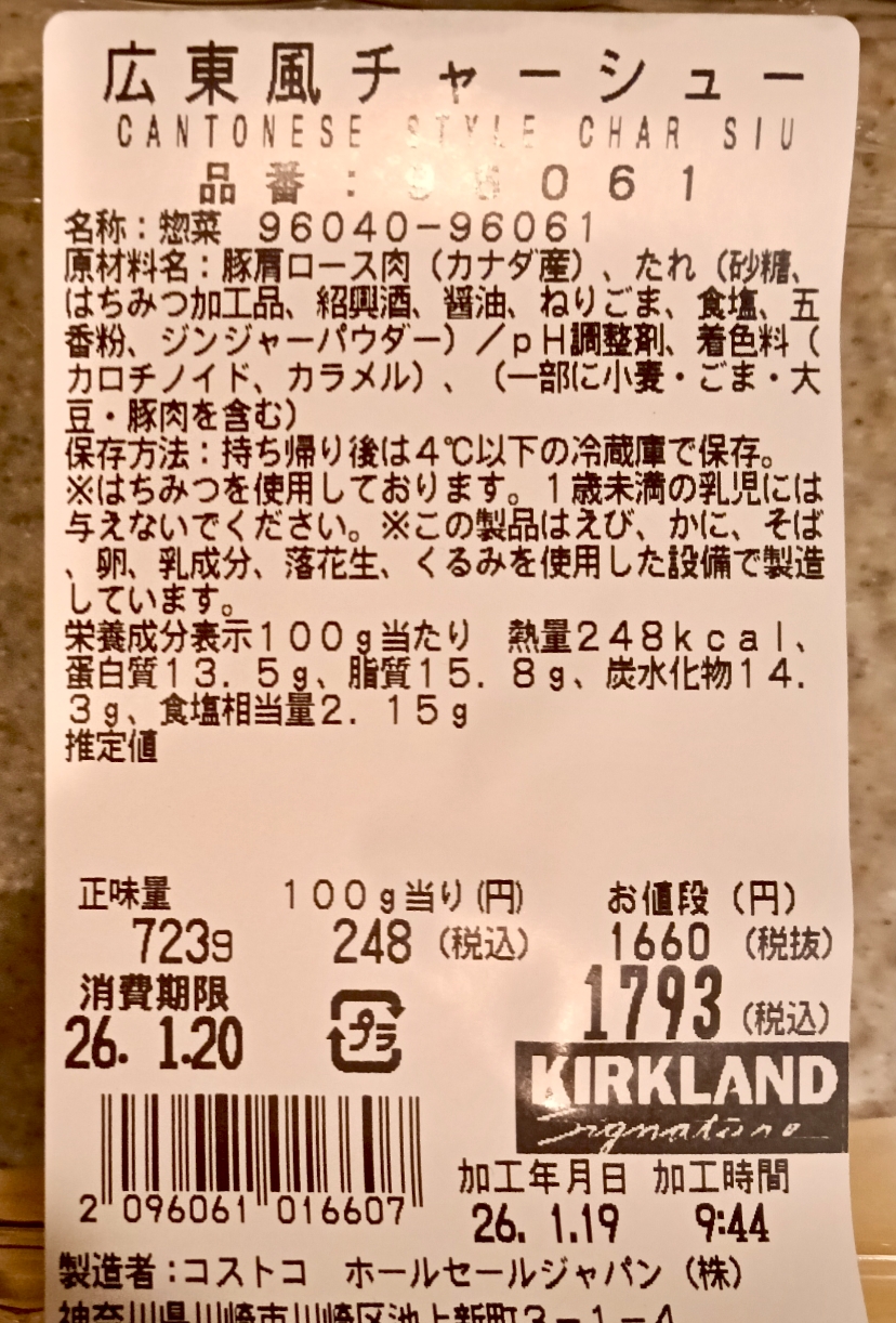 town神奈川県川崎市川崎food海外のお料理食べ物焼豚コストコfood 国別中国 川崎コストコ広東風チャーシュー 2026年1月コストコ 広東風チャーシューで気分は香港島 Oplus_131072 2026.01.29 最近よく買っているこちら。奥さんが照りの良いのを選んでくれました。横浜の中華街でよく店先にぶらさがっているのを見たことを思い出して。723g1793円で100g当り248円でした。夕飯はシンプルにチャーシュー丼です。 Oplus_131072 一緒に買った韓国のりフレークを添えて。中国と韓国と日本の土鍋ごはん。3国の友好の証しは2杯のおかわりで盛り上がりましたとさ。 Post Views: 10