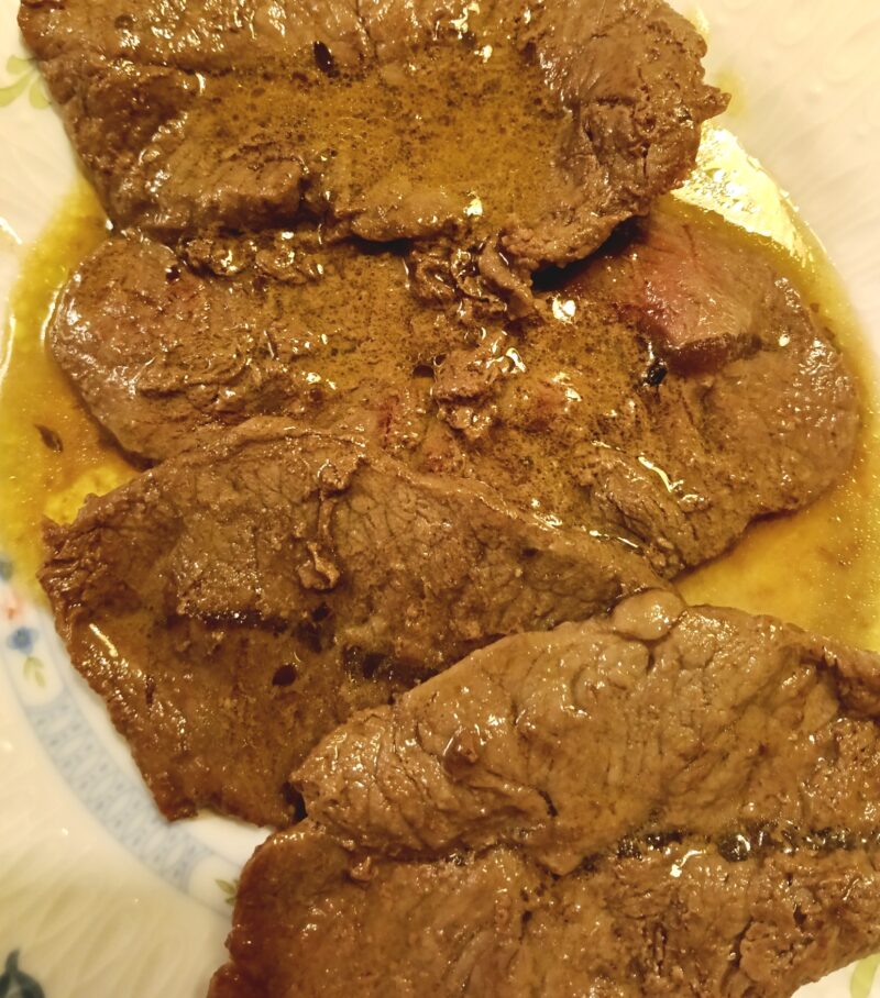 ナイフとフォークがすっと入ります。薄くスライスしてありますので、柔らかい。これアメリカのお肉?