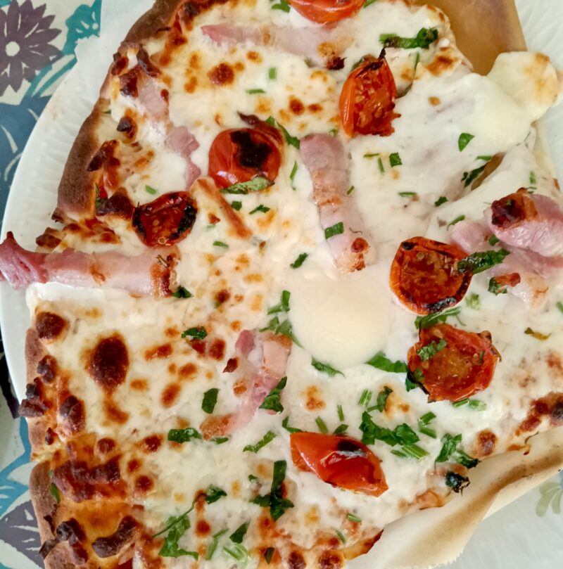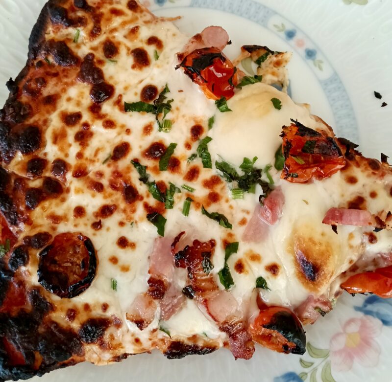 チーズ、トマト、パンチェッタ、ニンニクなど。ピアはアメリカ製だけど、ナポリの街角の窯焼きピツッアです。