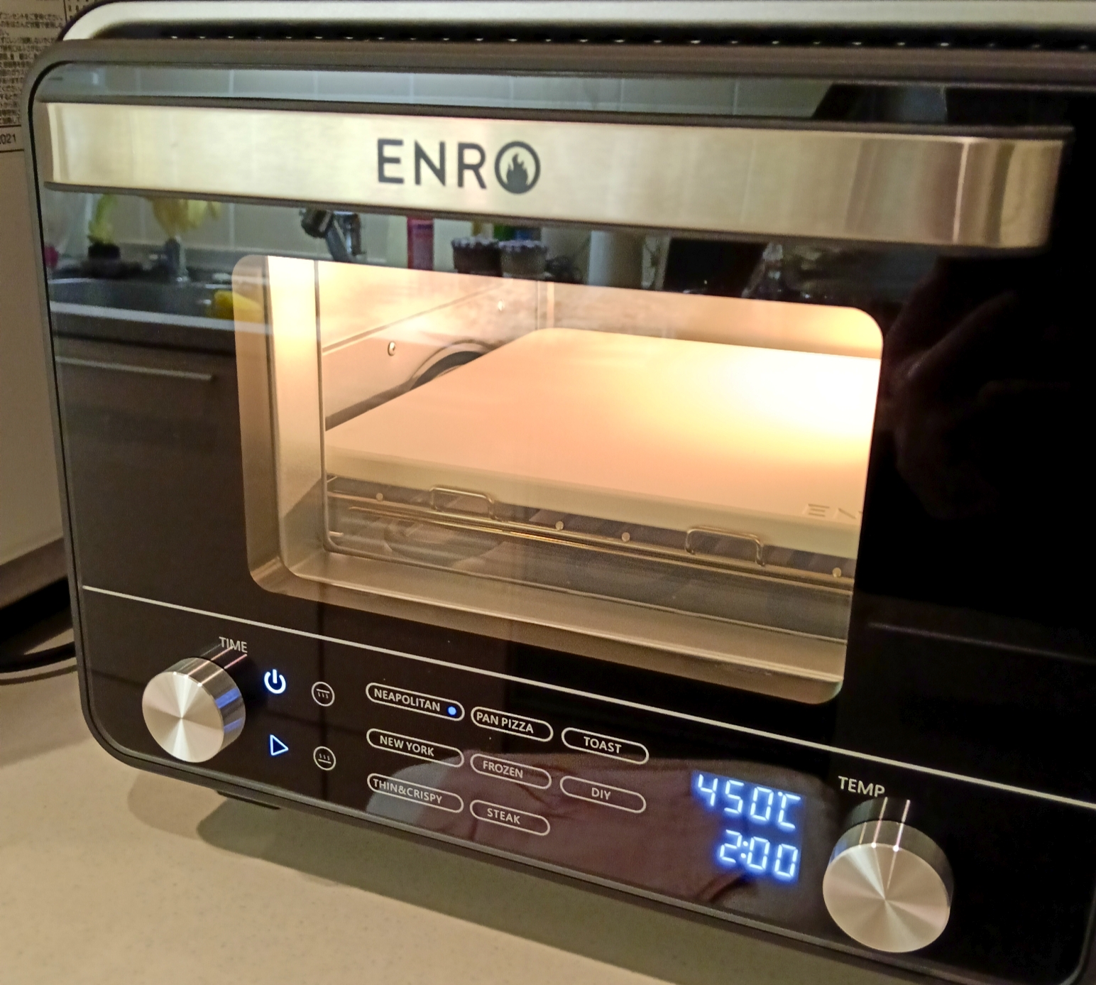 自宅で石窯で焼いたようなピザができると評判のエンロ。コストコで買った冷蔵ピザ、パンチェッタ&モッツァレラを焼きました。1980円でした。